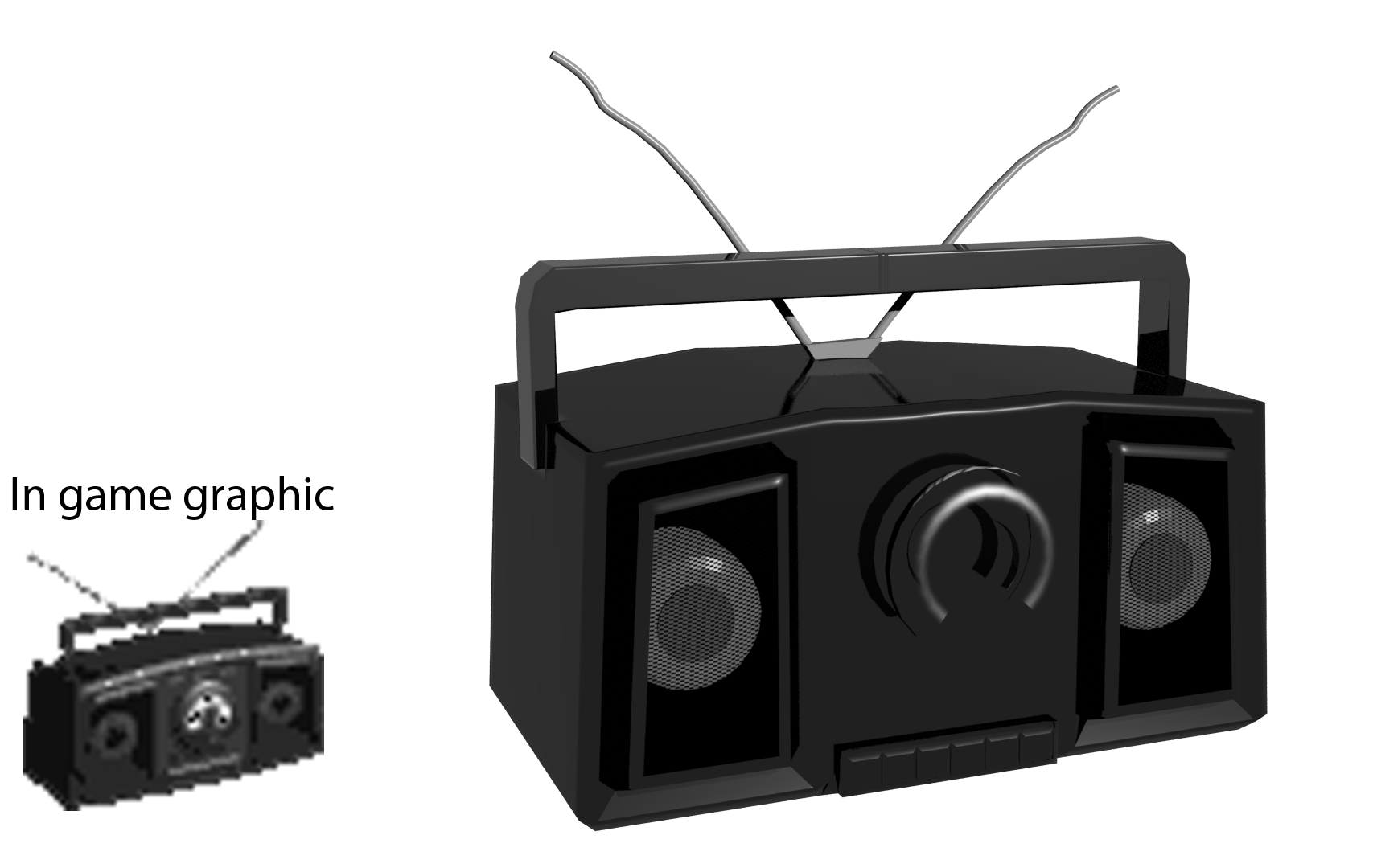 ^ Thank you for taking the time to reply. Those boom boxes have too many buttons and detail then the one in the game. I am trying to stay canon to the in game graphic. Get the overall likeness etc.