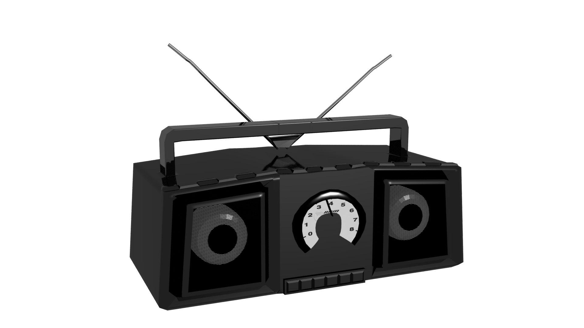Here is my first pass at modeling the BoomBox. Any pointers to improving and adding detail would be great. It is hard to tell what's what in the small in game graphic.