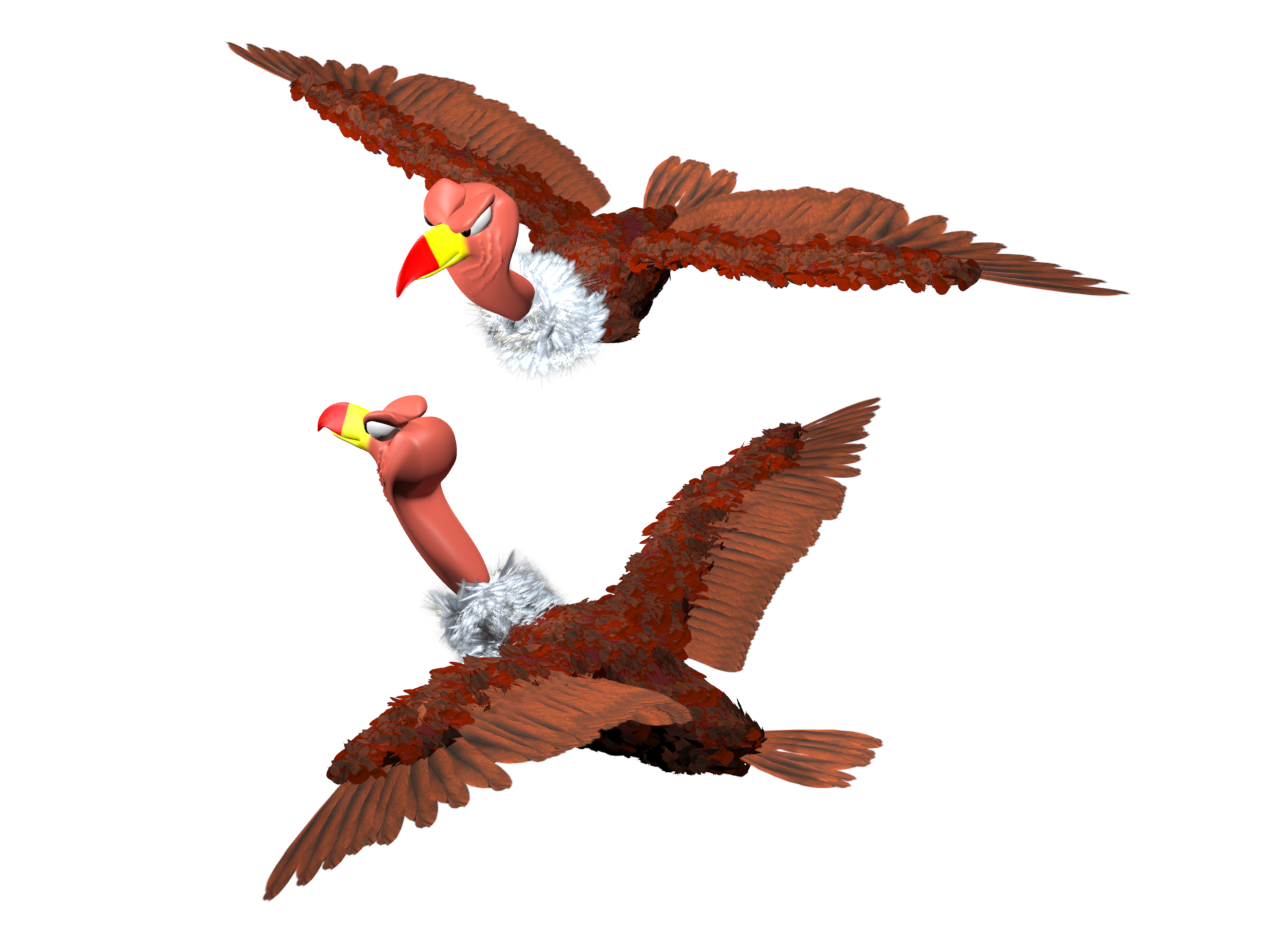 Here is a new version showing a different angle and with fixed feathers. Still a few not following the rules. Bad feather you. Also this is a wrong pose as his body is in a flying pose not standing like a bird would be doing with his wings folded like that. Still need to rig the body, neck and feet.