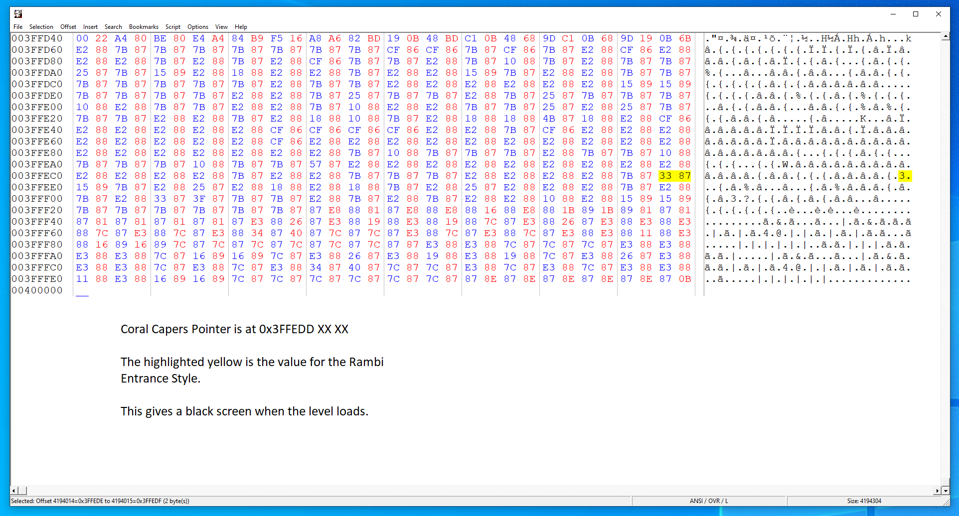 Oops. You are right about that glitch. I was misremembering. With the split-up glitch, you could take rambi to water levels. This is a water bug. Other levels work fine. The game crashes after the first frame. I know taking animals with the split-up glitch has various bugs. Your screenshot has 1 small mistake. You found the right pointer (good job on that by the way) but you labeled it incorrectly. The capers pointer is 3ffede. Your highlight shows that, but your note does not.