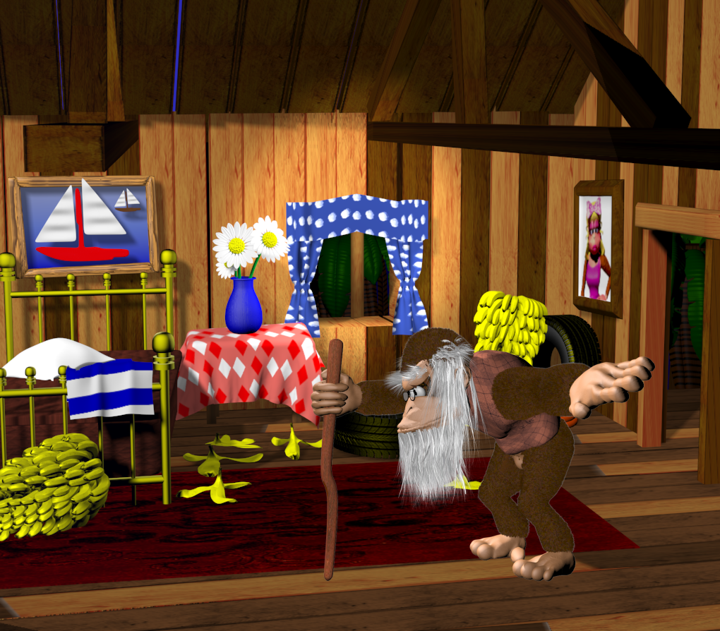 I also Included a test composition with Cranky in DK's house. Lacks shadows and proper lighting. It's just to get the an idea of what the final shot could look like. This scene is where Cranky Gets mad at DK for not watching over his hoard of bananas.