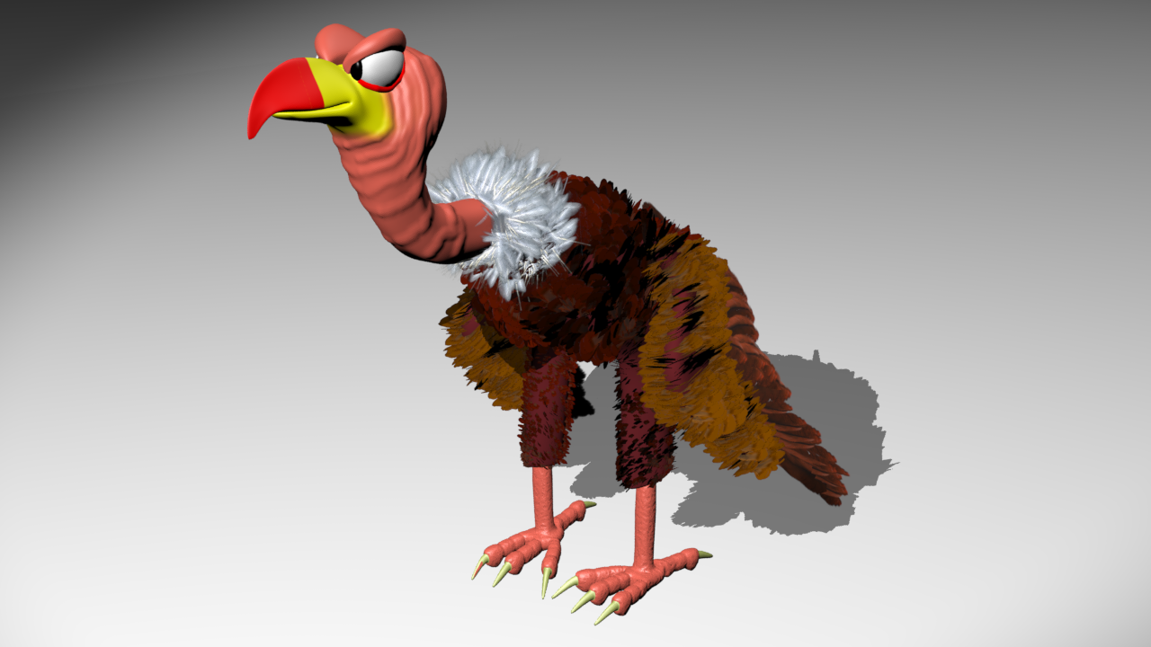 The feathery texture on Sqwawks I used particle objects that were attached to the mesh using Particle Flow. Necky is using feather objects distributed with the hair/fur modifier. Similar approaches but different tools.