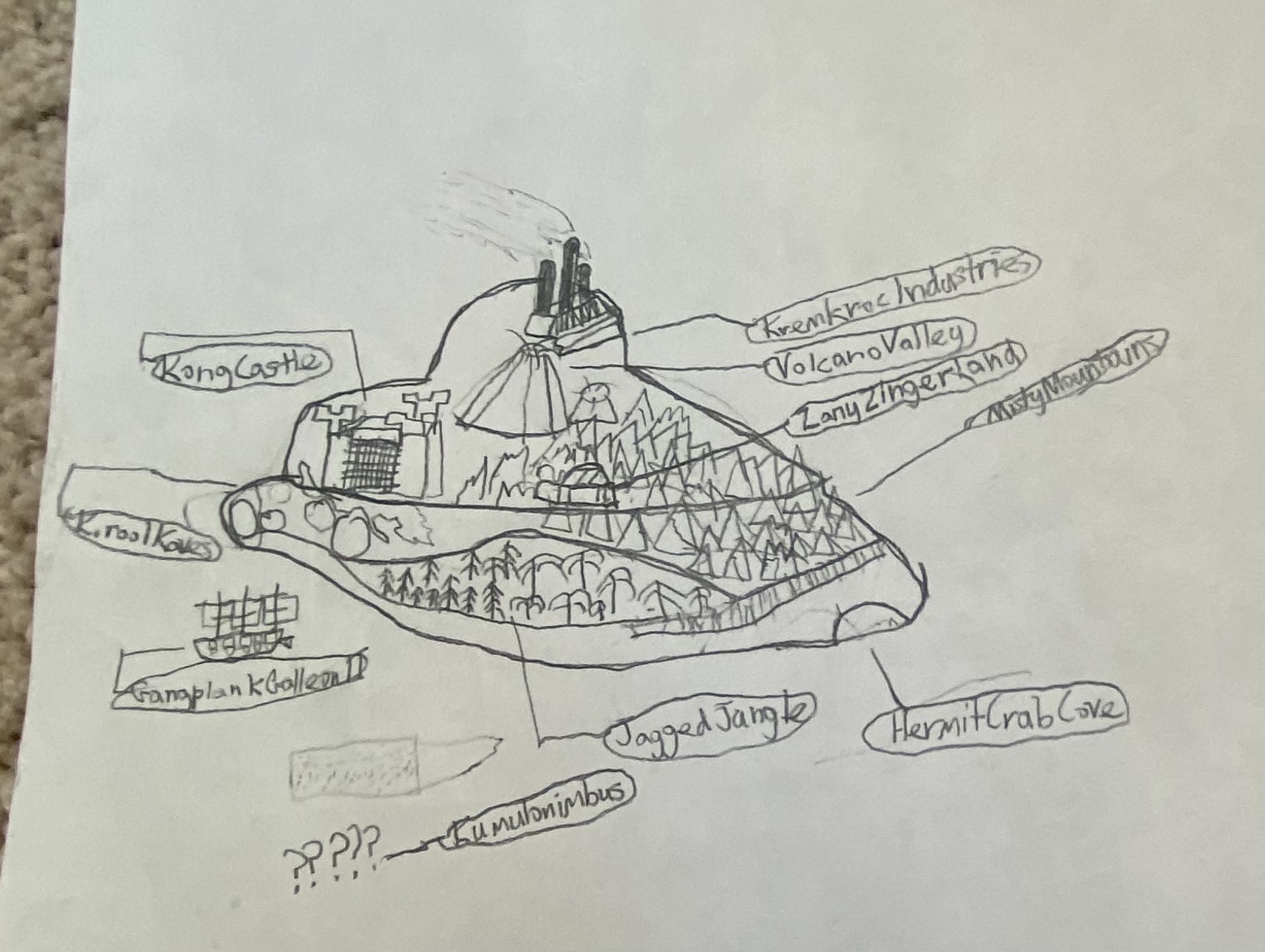 I do have a rough sketch of the world map which takes place on the other side of DK Island.