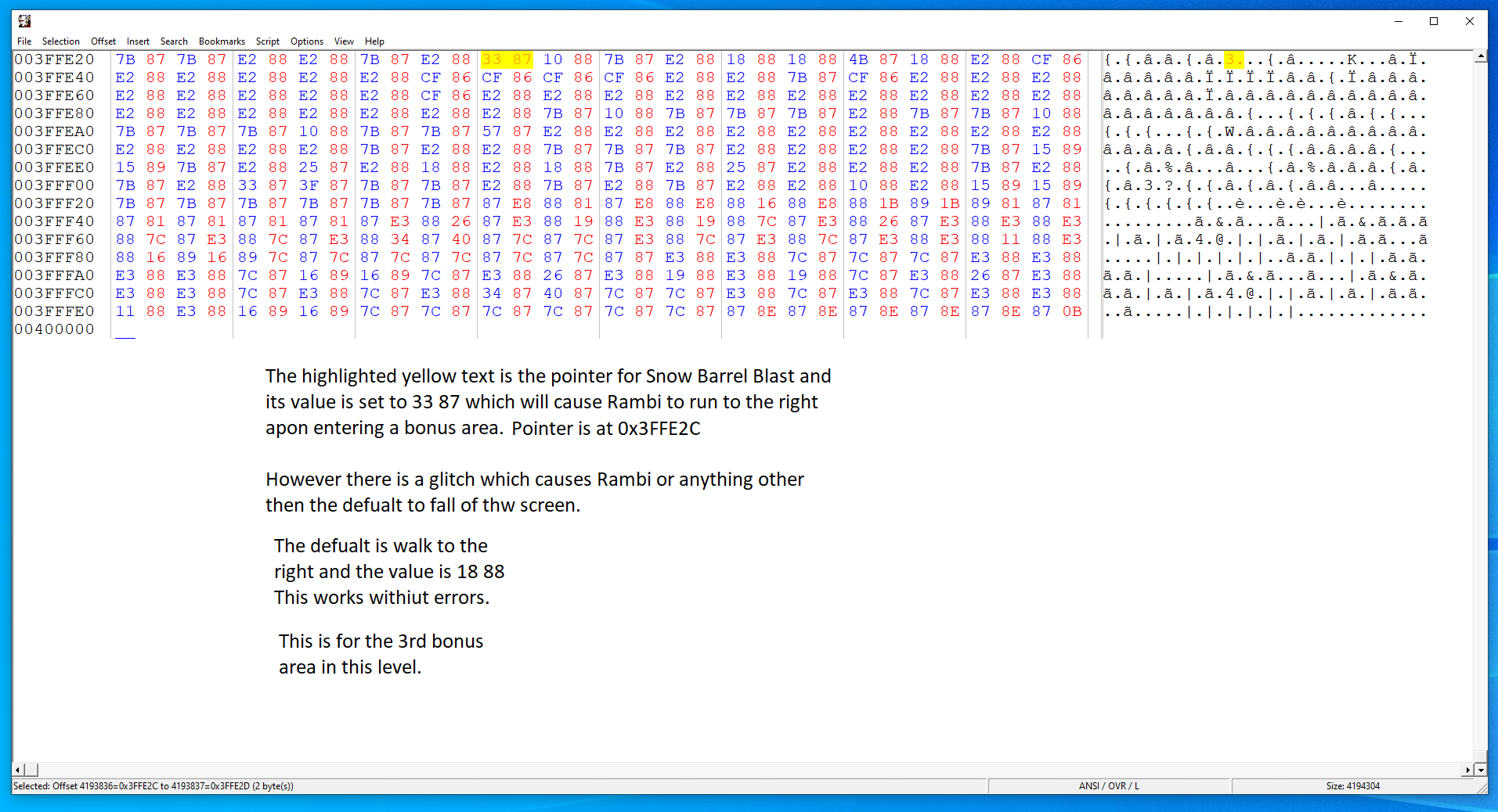 Oops. You are right about that glitch. I was misremembering. With the split-up glitch, you could take rambi to water levels. This is a water bug. Other levels work fine. The game crashes after the first frame. I know taking animals with the split-up glitch has various bugs. Your screenshot has 1 small mistake. You found the right pointer (good job on that by the way) but you labeled it incorrectly. The capers pointer is 3ffede. Your highlight shows that, but your note does not.