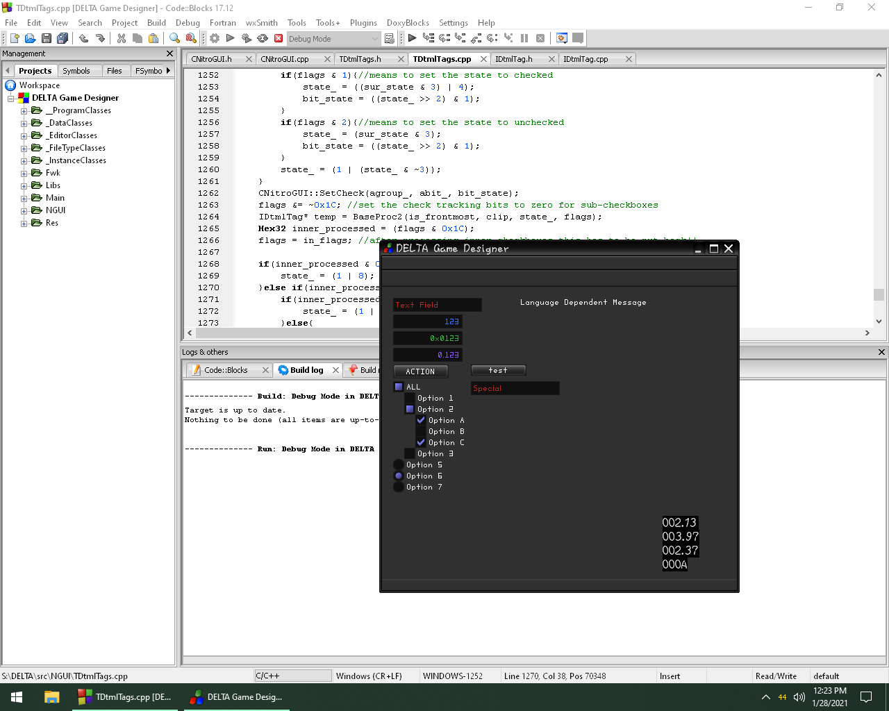 I've gotten the vast majority of the non-DELTA-specific GUI elements done, I've debugged the heck out of NitroGUI's message system, added code for a proper languages system, have the GUI scalable for those users that have problems reading or viewing the smaller interface elements (especially text), and much more...